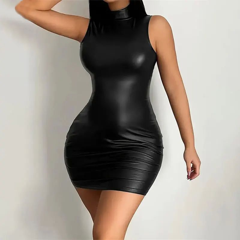 Elevate your allure with this Leather High-Neck Slim-Fit Bodycon Dress. Designed with a sleek stand collar and smooth leather finish, it sculpts your curves for a bold, confident, and irresistibly sexy look.
