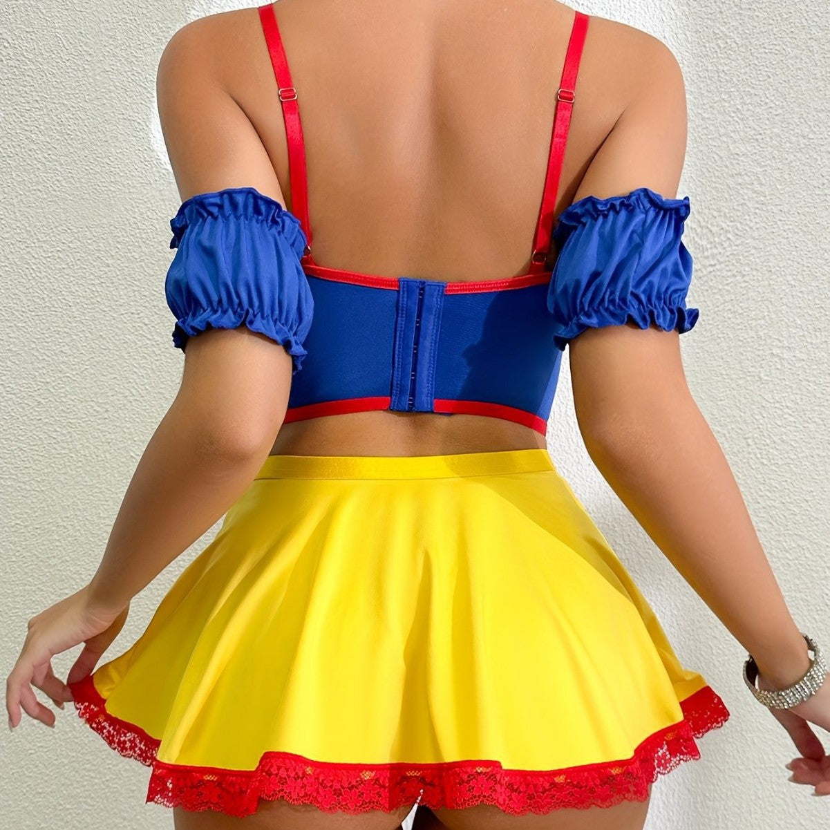 Turn up the heat with this sexy maid-inspired lingerie set. featuring a vibrant color combo of royal blue. red. and yellow. The lace-up corset top with delicate lace trim highlights your curves. while the mini skirt adds a playful and flirty edge.